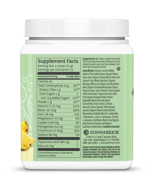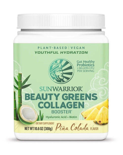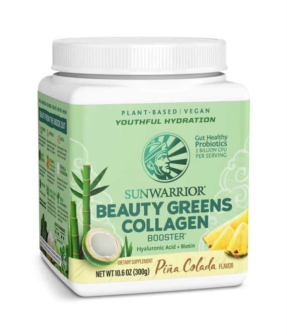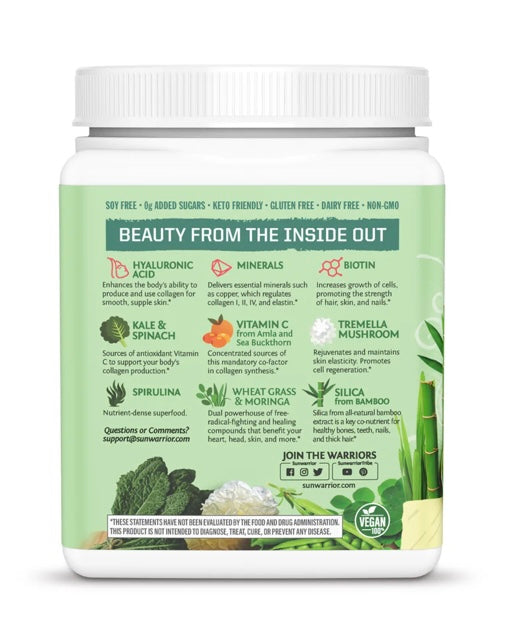 Wheatgrass juice, kale, moringa, and the equivalent of 1 vegetable serving provide the answer to aging brought on by oxidative stress. Sunwarrior's Beauty Greens Collagen Booster with Biotin and Hyaluronic Acid will help you alkalize, hydrate, and strengthen your cells from the inside out while boosting your body's inherent collagen production. Beautiful is more than looking great; Beautiful is feeling great!*