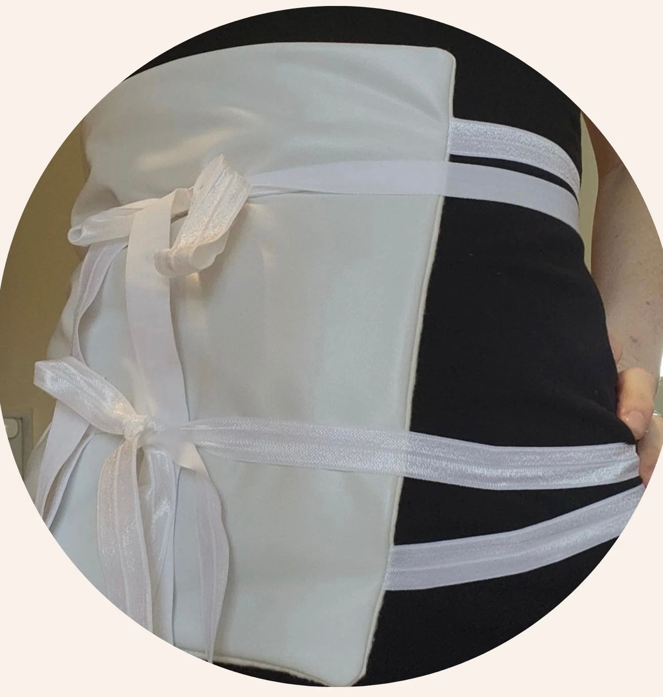 The cloth wrap measures 10x18 inches, not including the stretchy straps, which can stretch up to 66 inches in diameter. This makes it suitable for a wide range of body sizes. For smaller frames, wrap the straps around until it fits snugly. For larger bodies, tie the straps at your comfort level.