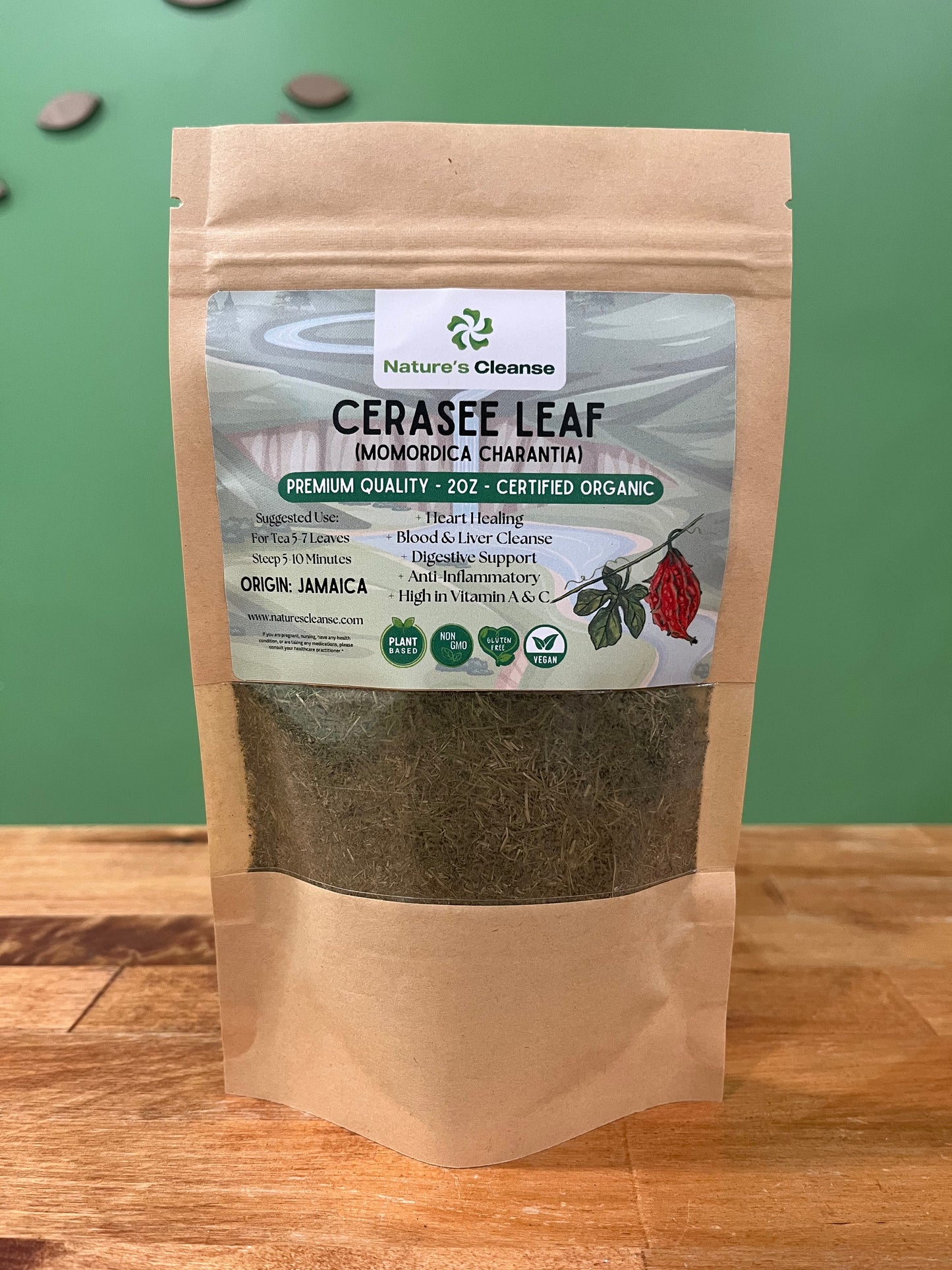 Cerasee leaf, from the Momordica charantia plant (also known as bitter melon), is a nutrient-rich herb used dried in teas, baths, or topical applications. It has a strong, bitter flavor and is packed with vitamins A and C, iron, phosphorus, polyphenols, and antioxidants. Traditionally used in Caribbean and Jamaican folk medicine to regulate blood sugar, support diabetes management, detoxify the blood, promote digestion, reduce inflammation, and aid skin health.