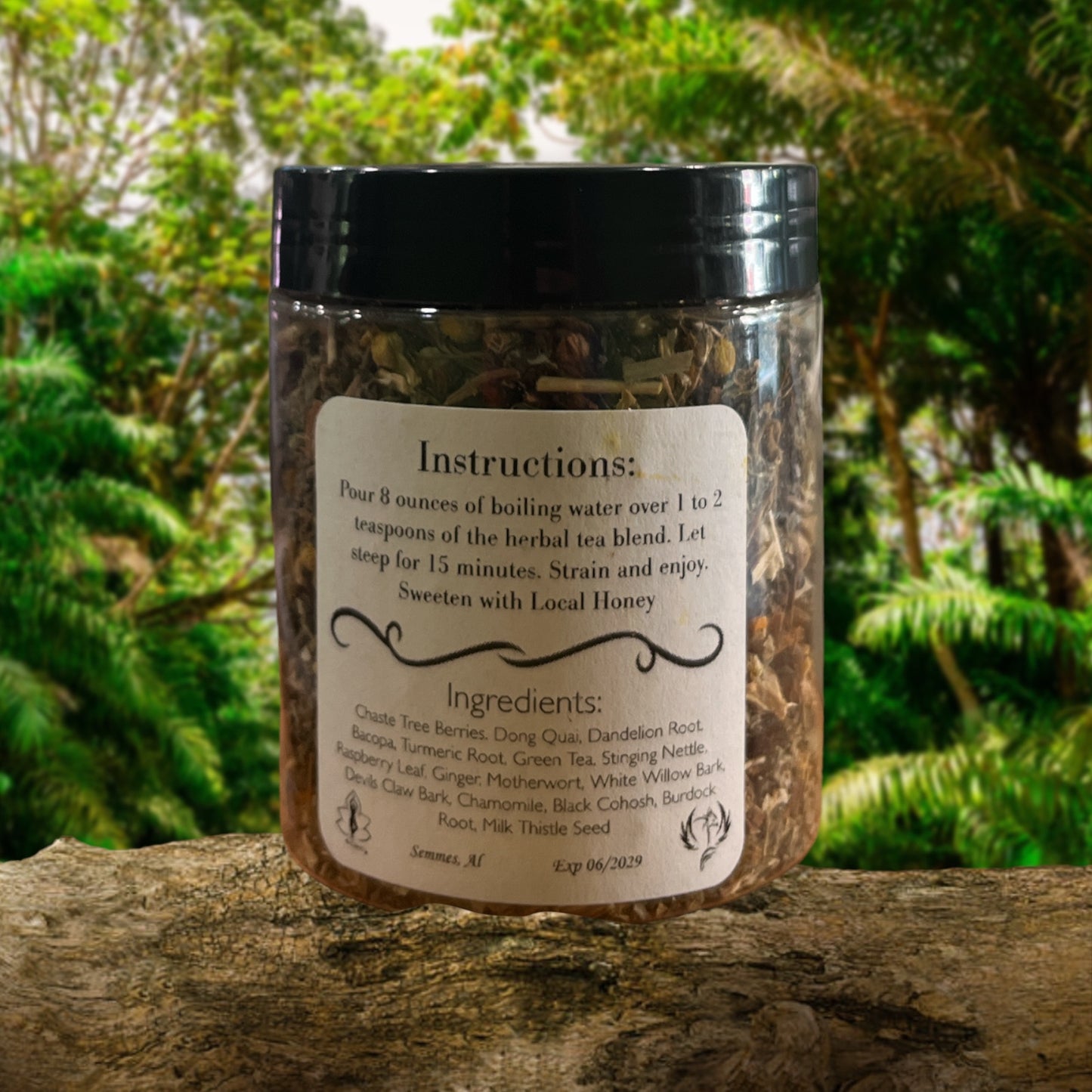 Ingredients: Chaste Tree Berries, Dong Quai, Dandelion Root, Bacopa, Turmeric Root, Green Tea, Stinging Nettle, Raspberry Leaf, Ginger, Motherwort, White Willow Bark, Devils Claw Bark, Chamomile, Black Cohosh, Burdock Root, Milk Thistle Seed.