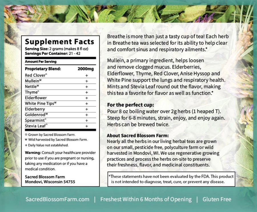 A meticulously crafted blend designed not only to delight your palate but also to provide a comforting aid for your sinus and respiratory health. Each herb in our Breathe blend is chosen for its potent properties in supporting clear breathing and overall respiratory wellness.