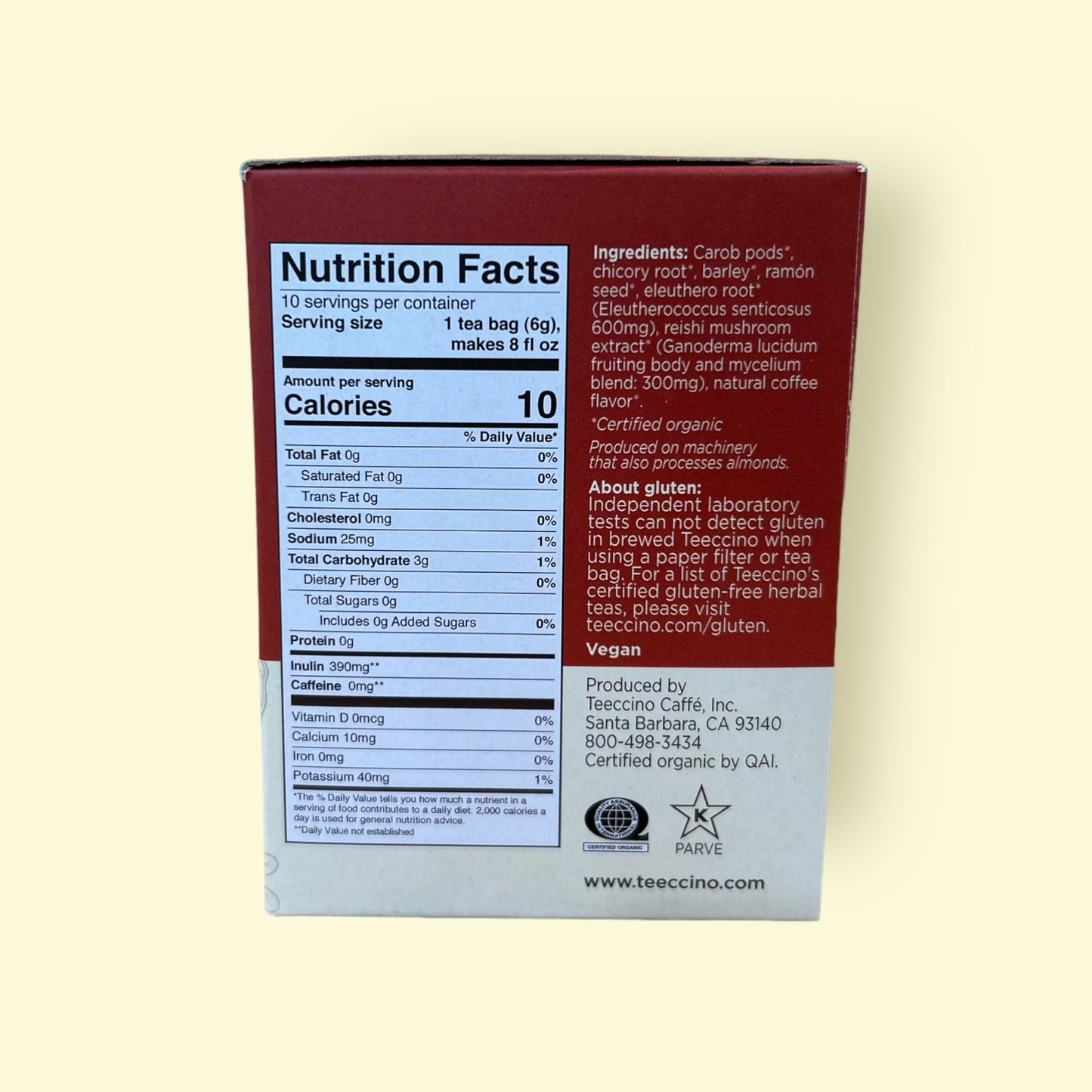 Ingredients: Carob pods*, chicory root*, barley*, ramón seed*, eleuthero root* (Eleutherococcus senticosus 600mg), reishi mushroom extract* (Ganoderma lucidum fruiting body and mycelium blend: 300mg), organic coffee flavor.