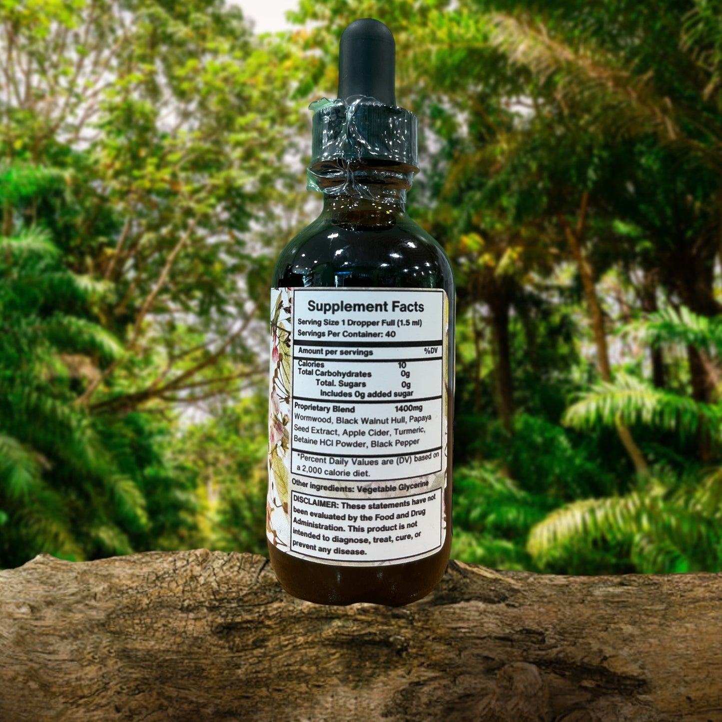 Ingredients: Wormwood, Black Walnut Hull, Papaya Seed Extract, Apple Cider, Turmeric, Betaine HCL Powder, Black Pepper.